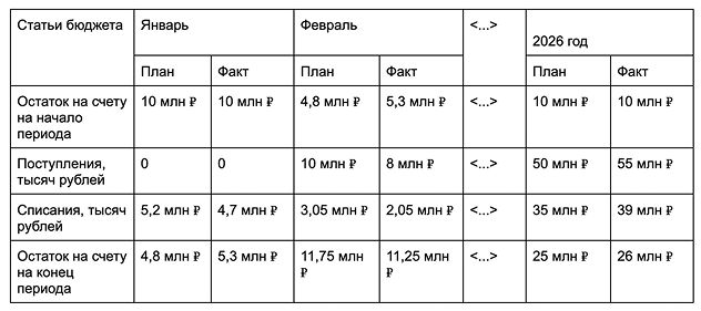 Второй момент — чтобы вам было легче понять принцип распределения доходов и расходов при бюджетировании, в БДР и БДДС мы учитывали одинаковые суммы. Например, январские расходы в БДР и списания в БДДС одинаковые — 5,2 млн ₽. По факту цифры могут отличаться из-за разницы в учете — кассовый или метод начислений.