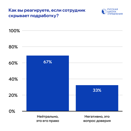 Большинство руководителей спокойно относятся к тому, что сотрудник не афиширует свои подработки — 67% считают, что это личное дело каждого. Однако 33% признались, что подобное поведение подрывает их доверие.