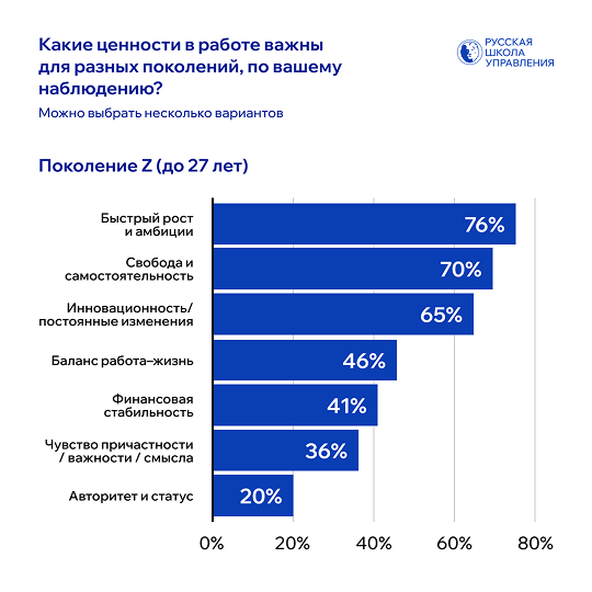 Русская Школа Управления провела опрос среди руководителей и HR-специалистов, чтобы выяснить, какие ценности в работе они наблюдают у представителей разных поколений и какие темы чаще всего становятся причиной недопонимания внутри команд.